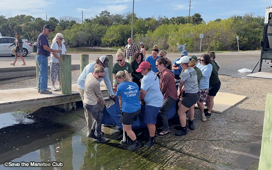 Durante el verano, participamos en el rescate de un manatí en Oak Hill, en la costa este de Florida. Calabazza, como la llamaron posteriormente, fue encontrada flotando en la superficie tras ser golpeada por una embarcación. Después de seis meses de rehabilitación en SeaWorld, a principios de enero ayudamos a devolverla a su hábitat natural en la costa. Con casi 680 kilos, era un ejemplar enorme, y se necesitó un gran equipo para bajarla del camión de transporte y llevarla en camilla hasta el agua, donde nadó con entusiasmo.